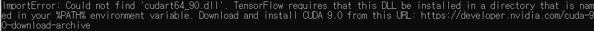 ImportError: Could not find 'cudart64_90.dll'. TensorFlow requires that this DLL be installed in a directory that is named in your %PATH% environment variable. Download and install CUDA 9.0 from this URL: https://developer.nvidia.com/cuda-90-download-archive