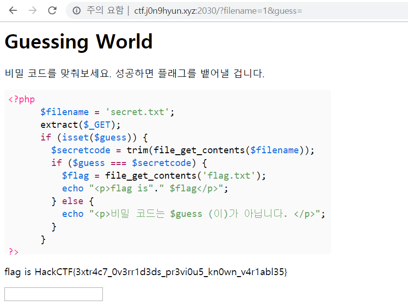 문제를 풀기 위해서 $filename의 값을 바꾸고, $filename의 값을 아무 값으로 변경한다면 해당 파일은 존재하지 않을 것이므로 guess에 아무 값도 입력해주지 않는다면 $guess===$secretcode가 true되어 flag가 나올 것이다.